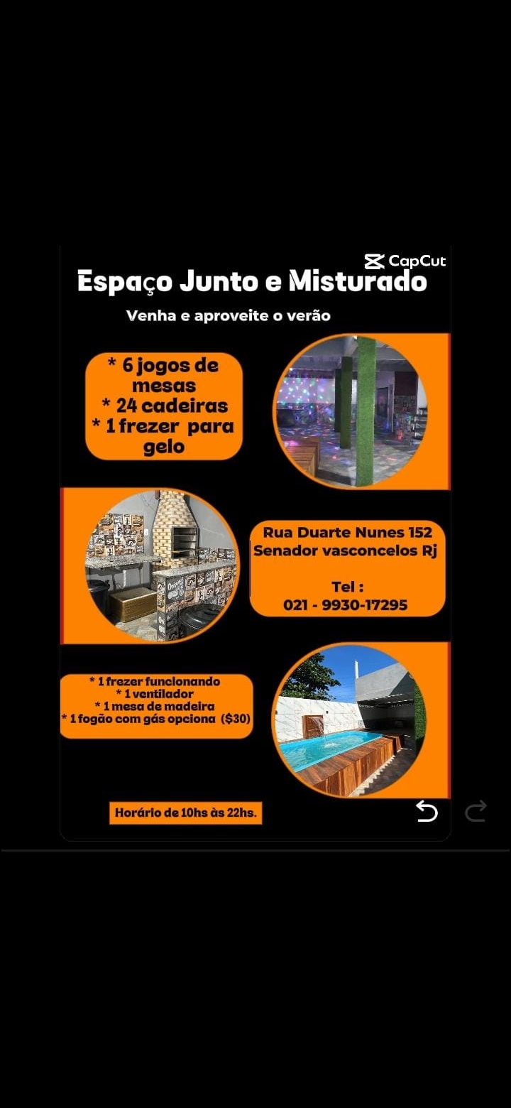 Nosso espaço possui 6 jogos de mesa com 24 cadeiras, churrasqueira, 2 banheiros, um chuveirão, um freezer, um fogão com gás ( operacional), 2 latas de lixo grande, uma mesa de madeira grande.