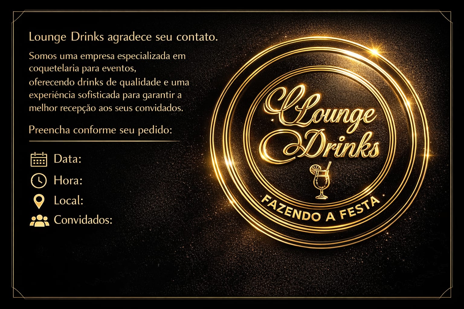 Sejam bem vindo. Somos uma conceituada empresa no ramo da coquetelaria. Aproveita e nos siga no Instagram @lougedrinks e fique por dentro do nosso trabalho, desde já agradeço e estamos ansiosos para te atender. 🤵🏽♂🍹