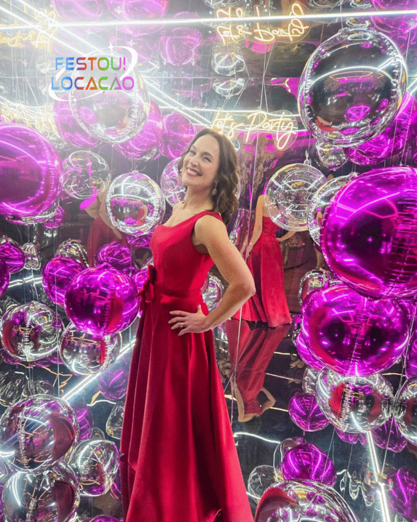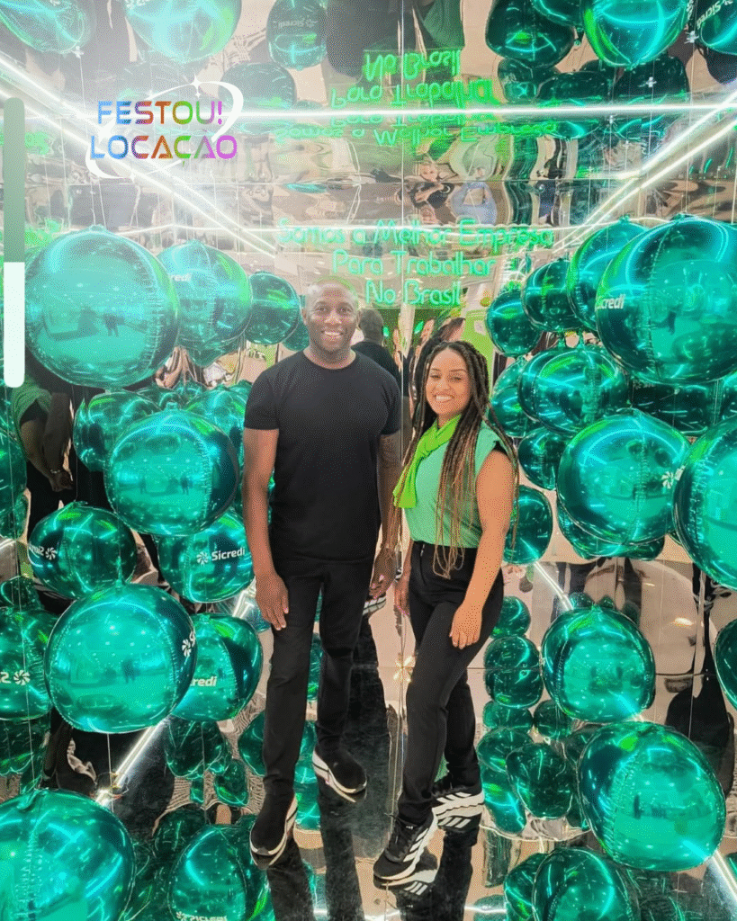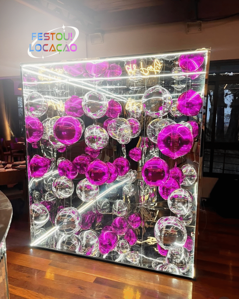 A Cabine Espelhada é muito mais do que um espaço para fotos — ela faz parte da decoração da festa, valorizando o ambiente com seu design espelhado e balões personalizados nas cores da sua paleta.